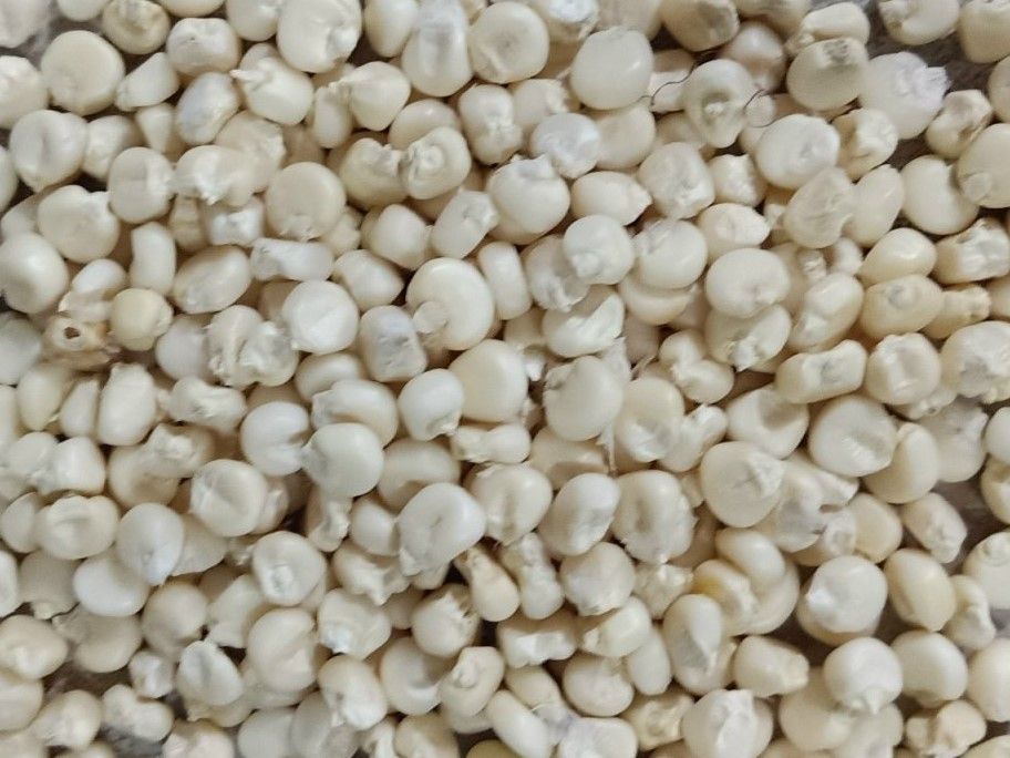 Bắp trắng hạt được xay và chà bể để loại bỏ cuốn và vỏ, còn lại nhân bắp trắng rất tiện sử dụng ngay trong các món chè bắp, làm xôi bắp.